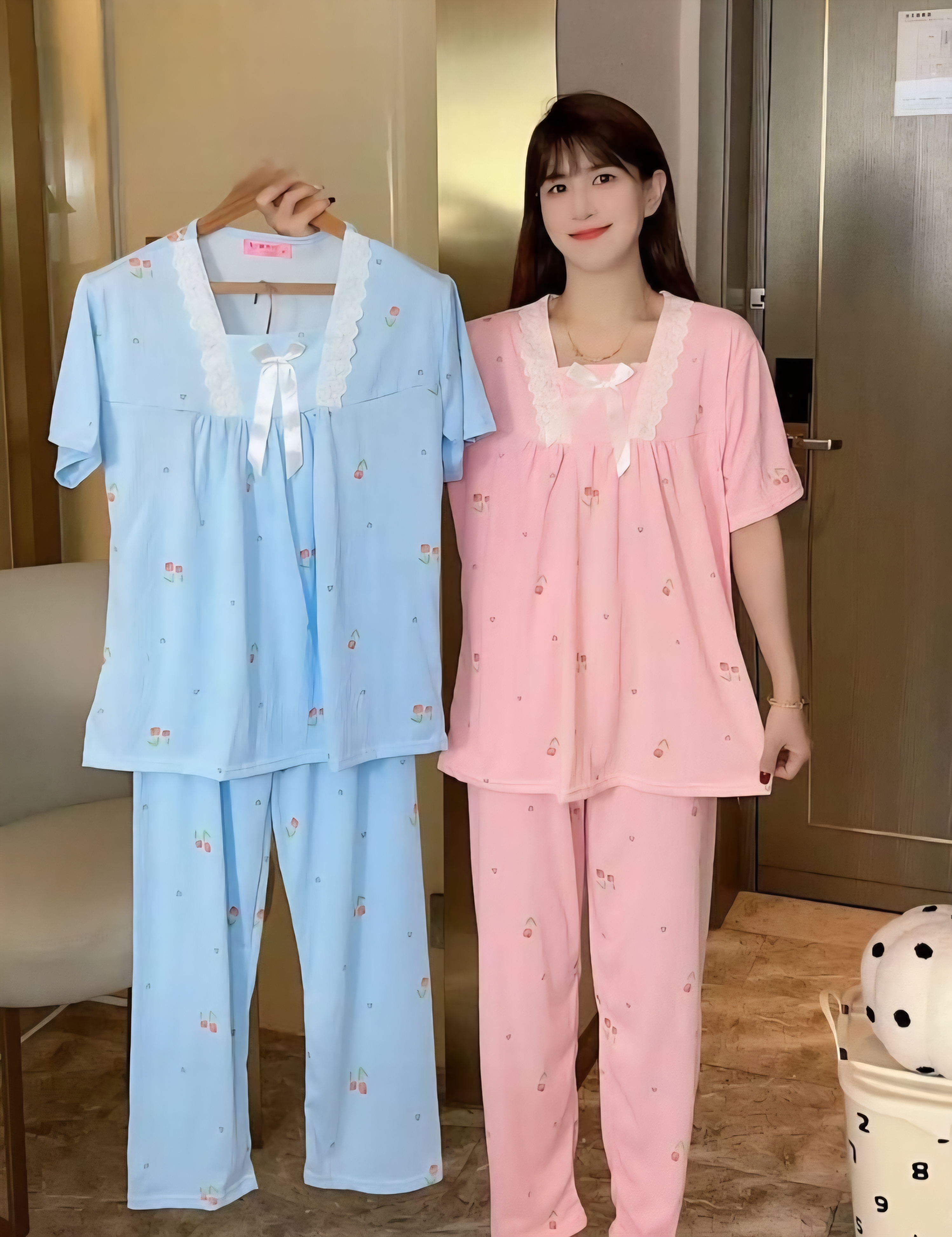 تیشرت شلوار عروسکی🤩 فری سایز 38 تا 48🎀 دارای رنگ صورتی و ابی🌈 بسیار نرم و لطیف🔥 وارداتی🇨🇳 دارای کشسانی💞 طرح گل🌹 قد شلوار ۹۰🍭